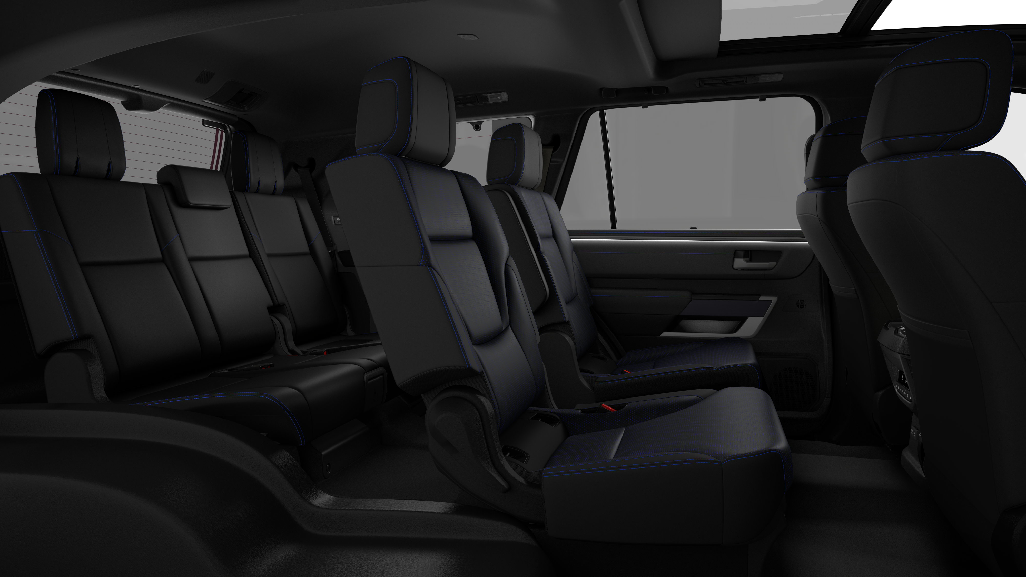 - Reclining, fold-down, fold-up, tumble-forward captain's chairs with center armrests on outboard seats; adjustable headrests; one-touch access to third row