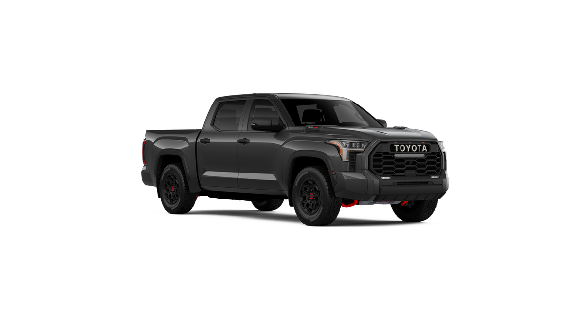 - "TRD PRO" hood badge; black door handles; black window molding and mirror caps; black technical-camo-grained tailgate spoiler and overfenders with marker lights