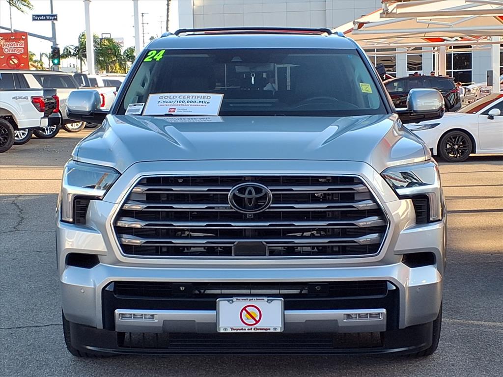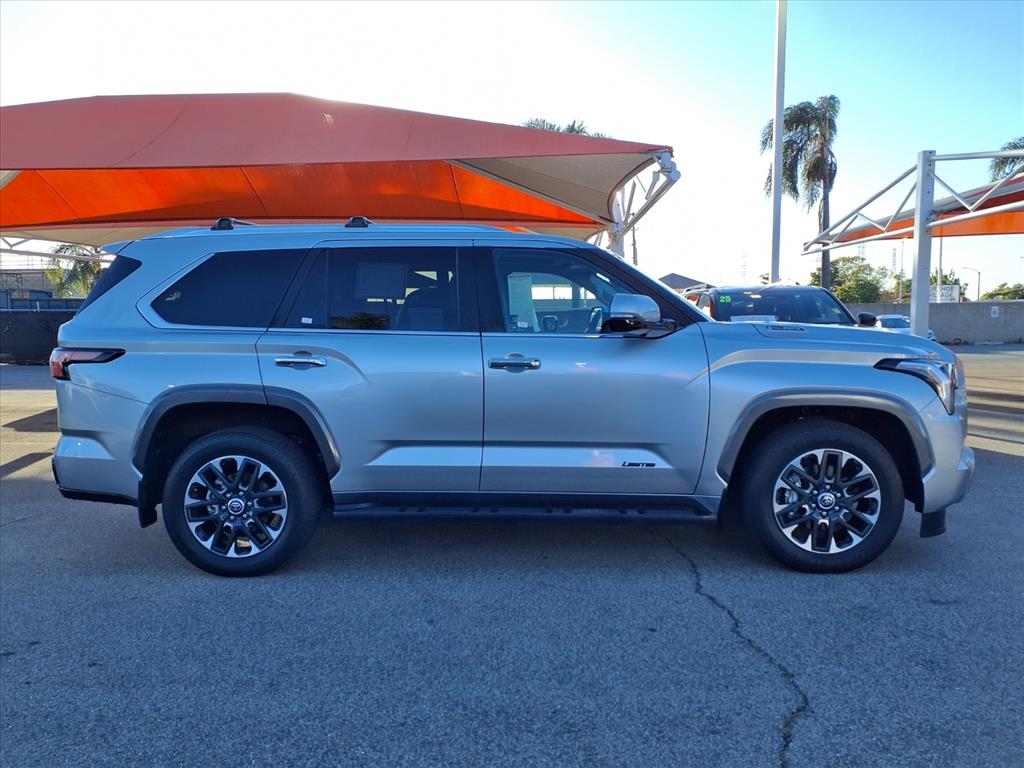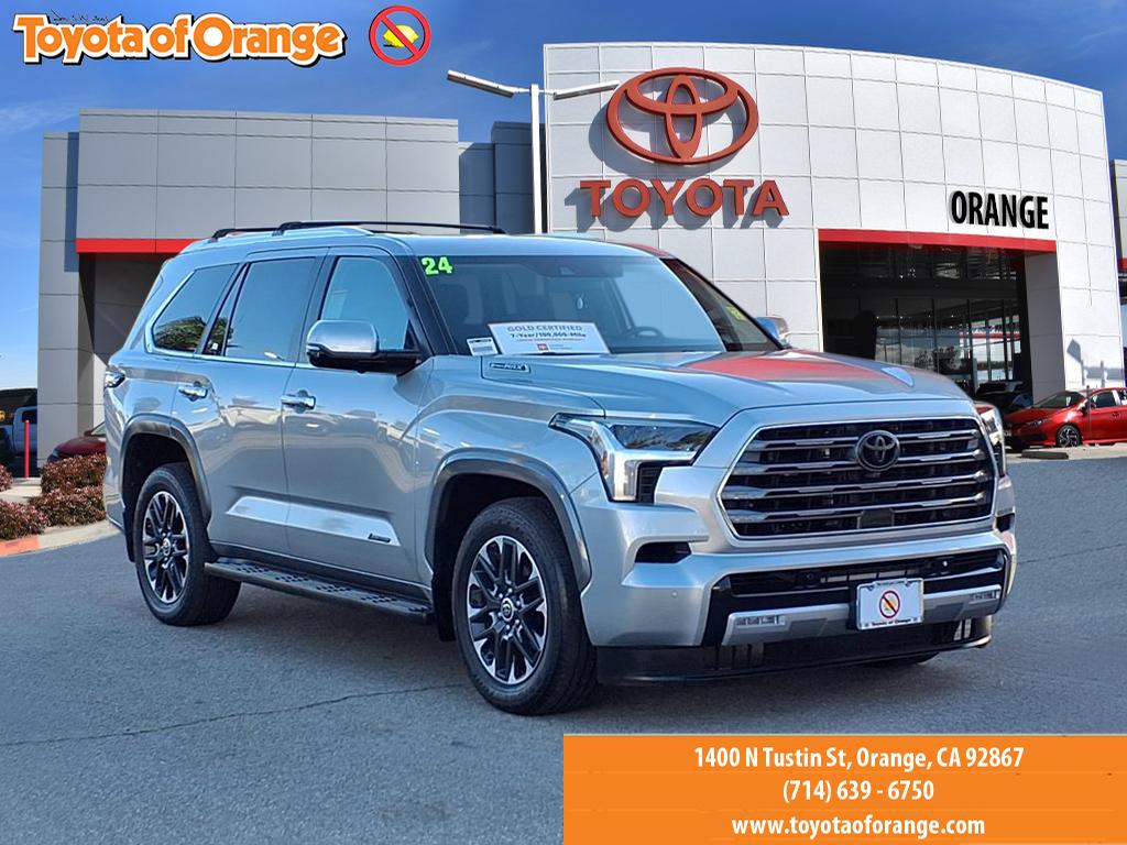 CARFAX 1-Owner, Toyota Certified, Excellent Condition. Limited trim. Heated/Cooled Seats, Third Row Seat, Navigation, Moonroof, Rear Air, Power Liftgate, Turbo Charged, 4x4, Trailer Hitch, POWER TILT/SLIDE PANORAMIC ROOF W/POW... CLICK ME!KEY FEATURES INCLUDEThird Row Seat, Navigation, 4x4, Power Liftgate, Rear Air, Heated Driver Seat, Cooled Driver Seat, Back-Up Camera, Running Boards, Turbocharged, Hybrid, Satellite Radio, iPod/MP3 Input, Onboard Communications System, Trailer Hitch. Rear Spoiler, MP3 Player, Remote Trunk Release, Keyless Entry, Child Safety Locks.OPTION PACKAGESJBL 14 SPEAKERS subwoofer and amplifier, Wireless Smartphone Charger, Qi-compatible w/charge indicator light, POWER TILT/SLIDE PANORAMIC ROOF W/POWER SUNSHADE, ROOF CROSS BARS (TMS). Toyota Limited with Celestial Silver Metallic exterior and Black interior features a V6 Cylinder Engine with 437 HP at 5200 RPM*.BUY WITH CONFIDENCECARFAX 1-Owner Certified vehicles must pass a thorough 160-point inspection, 7 Year/100,000 Mile Limited Powertrain Warranty, 12-Month/12,000-Mile Limited Comprehensive Warranty, 7 Year Roadside Assistance includes jump starts, lockouts, fuel delivery, flat tire service and more, Free CarFax Vehicle History Report includedWHY BUY FROM USOur customers are our most valuable asset. If you are already a customer, welcome back. If you are new to Toyota of Orange, we would like to convince you to join the ranks of satisfied Toyota of Orange customers.Pricing analysis performed on 3/3/2026. Horsepower calculations based on trim engine configuration. Please confirm the accuracy of the included equipment by calling us prior to purchase.